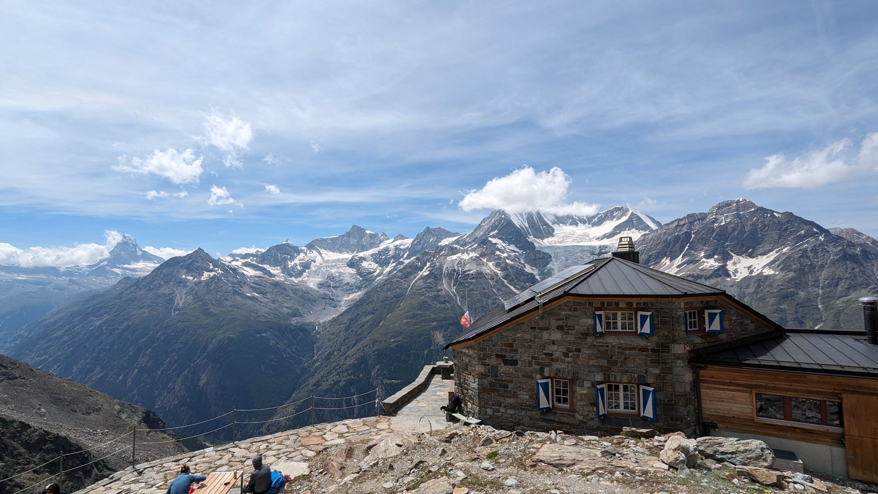 Charaktervolle Hütte für Bergsteiger und Alpinwanderer, in einer Hochgebirgslandschaft mit traumhafter Bergkulisse hoch über Randa. Das Panorama reicht tatsächlich vom Breithorn via Matterhorn, Zinalrothorn und Weisshorn bis zum Balmhorn im entfernten Berner Oberland. Der Steinbau von 1957 war der erste dieser Art des Architekten Jakob Eschenmoser, der moderne An- und Umbau bietet Komfort und Standard von heute. Sommerbesteigungen von sieben Viertausendern der Mischabelgruppe möglich.